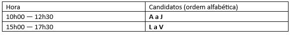Seguindo a ordem alfabética, verifique o período de realização da sua prova: