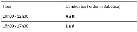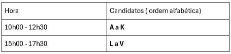 Devido ao elevado número de candidatos, as provas realizar-se-ão no Período da Manhã e Período da Tarde. Consulte abaixo o horário correspondente à primeira letra do seu nome.