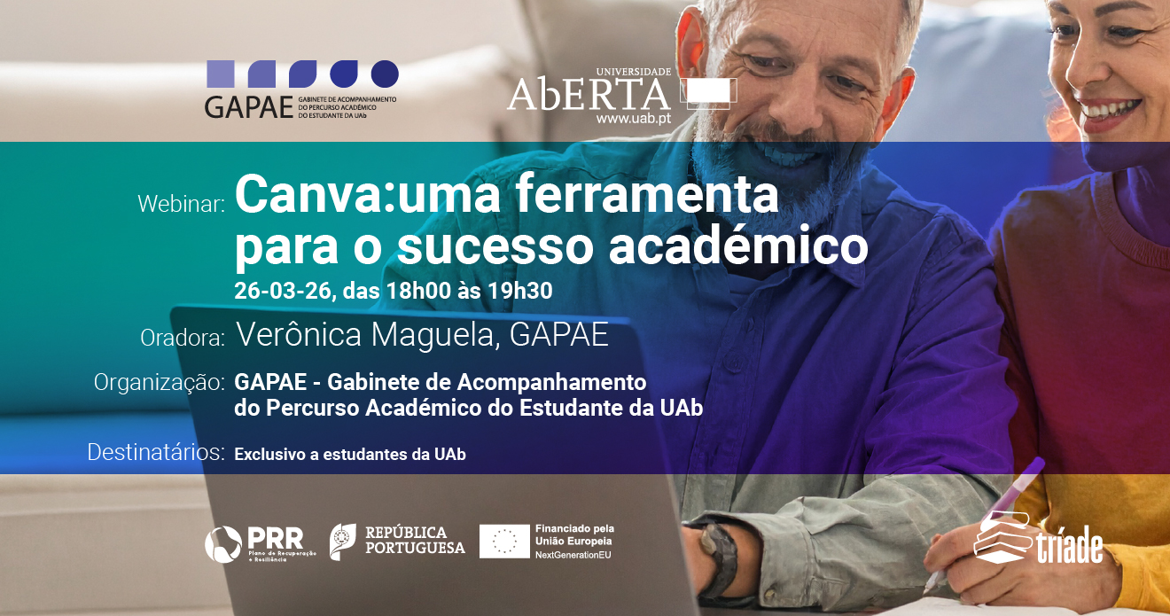 Com vista a apoiar os estudantes da Universidade Aberta (UAb), o Gabinete de Acompanhamento do Percurso Académico do Estudante (GAPAE) promove, no dia 26 de março de 2026, entre as 18h00 e as 19h30, o webinar “Canva: uma ferramenta para o sucesso académico”.