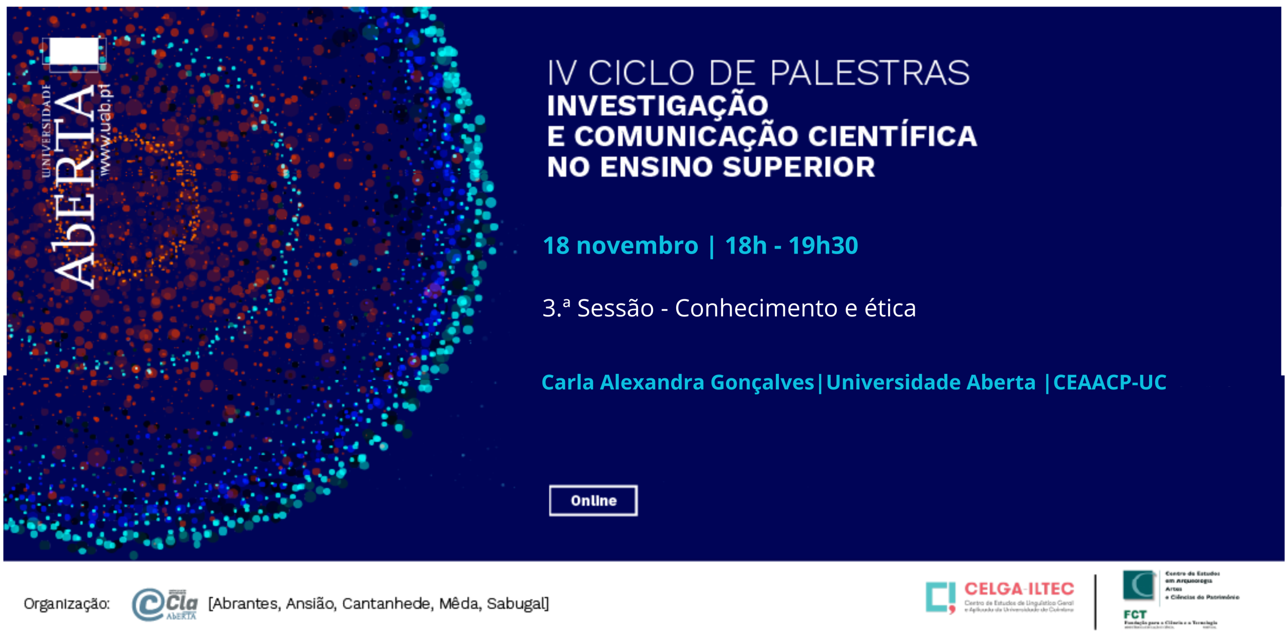 A 3.ª sessão do IV Ciclo de Palestras “Investigação e Comunicação Científica no Ensino Superior”, sob o título “Conhecimento e Ética” decorre no dia 18 de novembro, entre as 18h00 e as 19h30, e tem como oradora Carla Alexandra Gonçalves, docente na Universidade Aberta (UAb) e investigadora do CEAACP – UC.