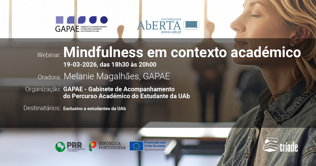 Destinado exclusivamente a estudantes da Universidade Aberta (UAb), realiza-se no dia 19 de março de 2026, entre as 18h30 e as 20h00, o webinar “Mindfulness em Contexto Académico”.