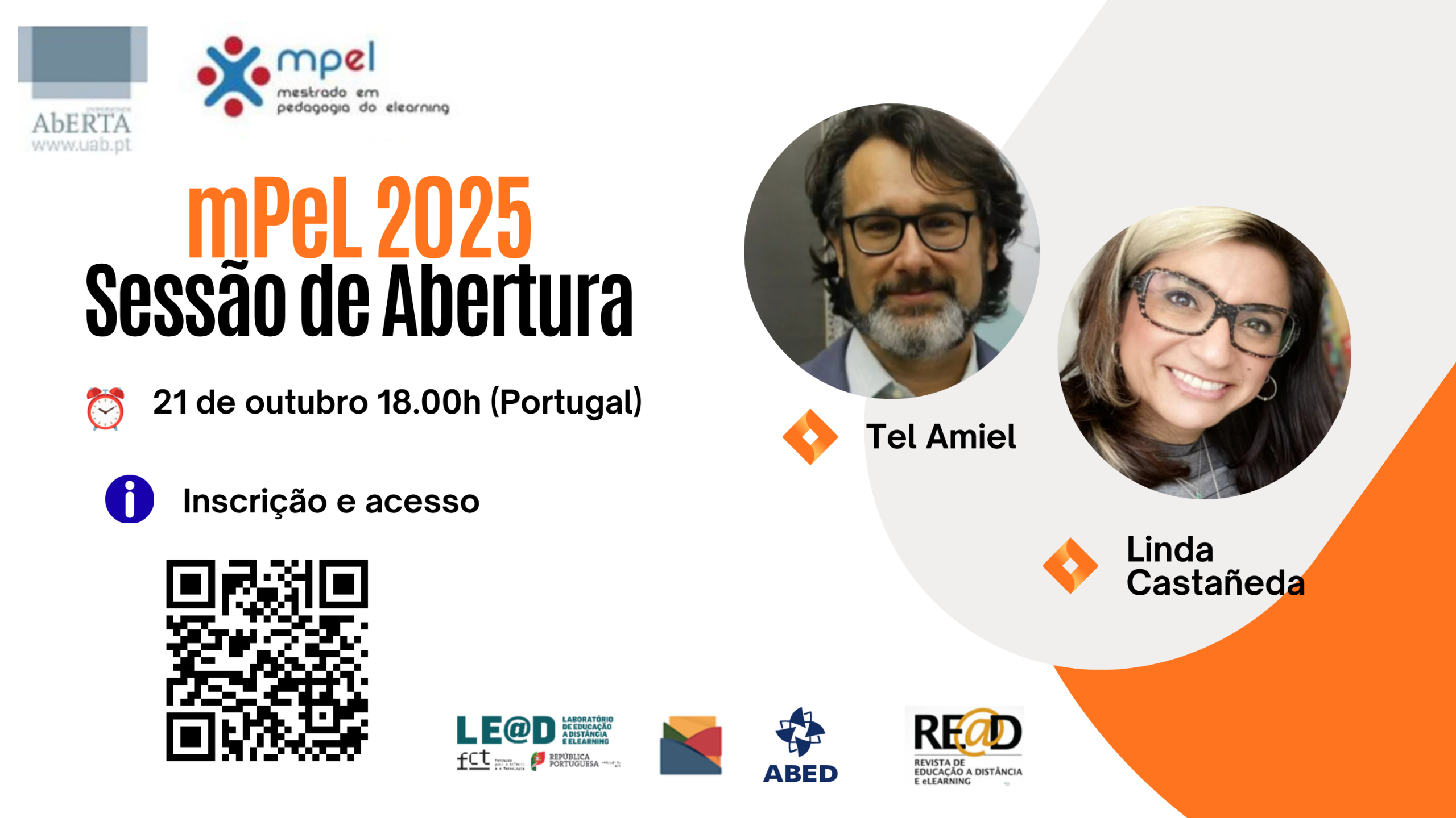 Tem lugar no dia 21 de outubro, pelas 18h00 – hora de Portugal, a sessão de abertura do Mestrado em Pedagogia do eLearning – mPeL, curso oferecido pelo Departamento de Educação e Ensino a Distância da Universidade Aberta, com o apoio do Laboratório e Educação a Distância e eLearning – LE@D.
