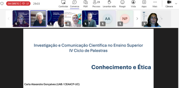 A 3.ª sessão do IV Ciclo de Palestras “Investigação e Comunicação Científica no Ensino Superior” foi dinamizada pela Professora Carla Alexandra Gonçalves, docente da Universidade Aberta e investigadora do Grupo de Estudos Multidisciplinares em Arte (GEMA), integrado no Centro de Estudos em Arqueologia, Artes e Ciências do Património (CEAACP/FCT/UC) da Universidade de Coimbra.