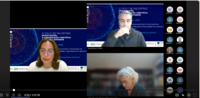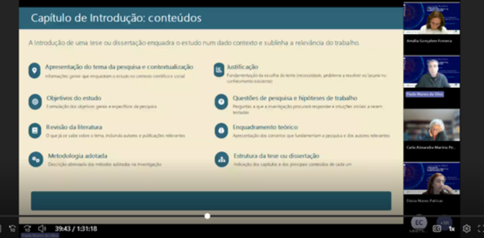 Seguidamente, foram abordados os conteúdos essenciais da Introdução, enquanto espaço de contextualização do estudo, definição da problemática e explicitação da relevância da investigação. Por fim, o docente centrou-se no papel das Conclusões, enquanto momento de síntese crítica do trabalho desenvolvido e de projeção de pistas para investigações futuras. A apresentação foi apoiada em exemplos práticos de índices, o que permitiu aos participantes compreender com maior clareza as diferenças entre dissertações de mestrado e teses de doutoramento, bem como as especificidades das várias áreas científicas.
